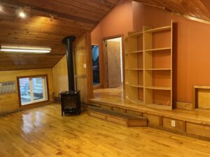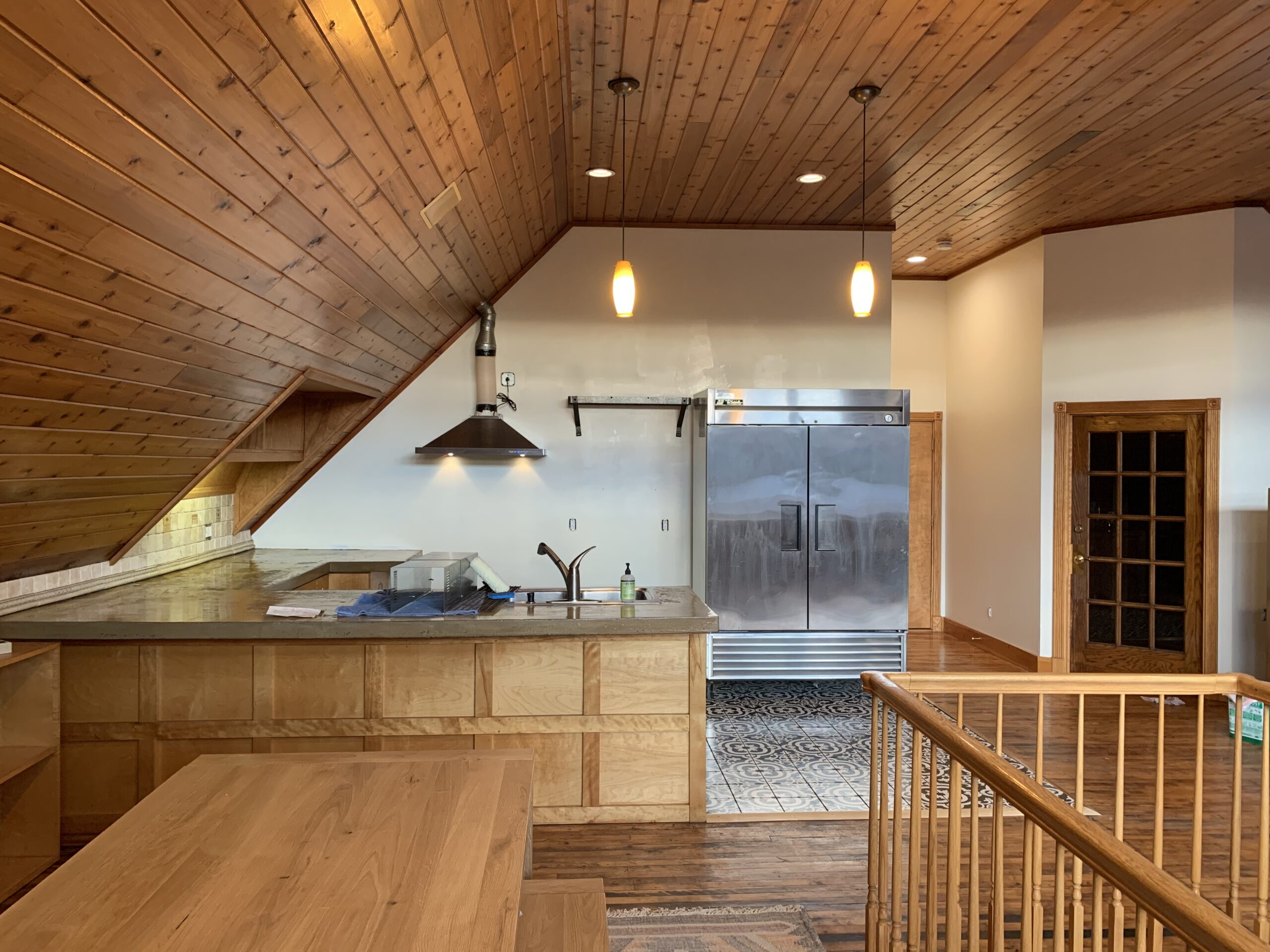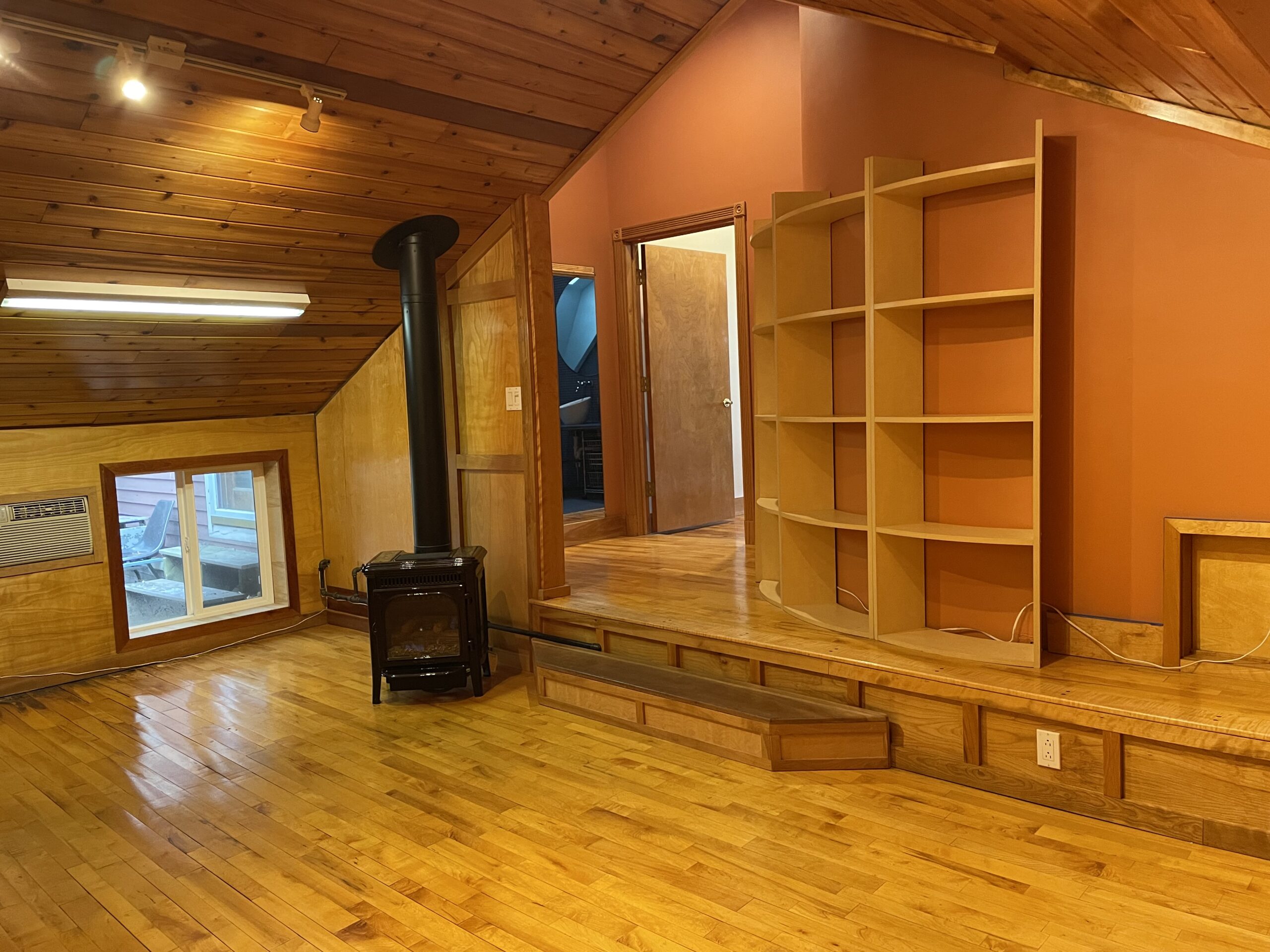 1200 square foot apartment and 750 square foot deck with free standing sauna. High ceilings, top floor, open kitchen and living space with wooden interior. Ceiling finished with tongue and groove pine board and hardwired, in-wall speakers. Kitchen has stainless steel commercial appliances, concrete counter, restaurant grade butcher block & stainless table. Certified commercial kitchen. Spacious bathroom with jacuzzi tub, open shower, modern finishes, on demand hot water heater, gas fireplaces for heat, AC and washer/dryer. Bricked patio in backyard to the east, with BBQ area. Enormous, private deck to the west with tall fencing and a free standing sauna! Walkup, access via the Hood parking lot. Parking, water, rubbish removal and compost are included. Heat, electric, cable, phone and internet are the responsibility of the tenant. Additional parking may be purchased. This is a very special and unique work space at The Hood Plant, which is a mixed-use community of residential spaces and offices for creative enterprises.